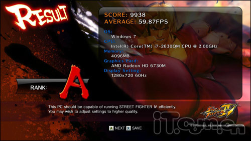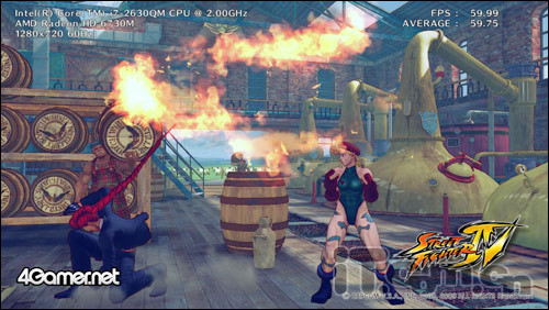 我们选取的是一段《街头霸王4》的pc版进行测试,我们把游戏的所有特效均设置为默认画质,分辨率为1280x720。测试结果是A。我们发现这款华硕A43SA在游戏过程可以达到高级玩家的要求,帧数能达到60帧以上。