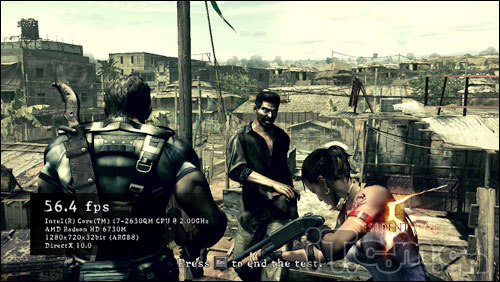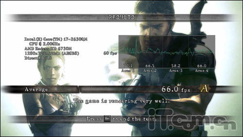 接下来是对《生化危机5》的PC版进行测试,在DirectX10.0模式下,将所有游戏特效设置为高,屏幕的分辨率是在默认的状况1280x720下进行的,在测试过程中,整机表现的是非常的流畅的,帧数一度达到80-90帧,最后的结果是自然是A。