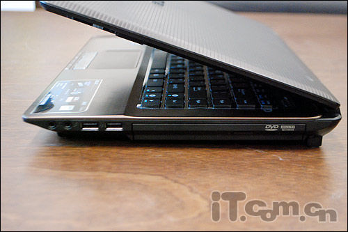 由于光驱在机身右侧设置的原因,主要的接口都已经设计在了机身的左侧,因此华硕A43SA机身右侧的接口分布不是很多,依然保持简洁风,接口分别是耳机、麦克音频输入输出接口、2个USB2.0接口以及DVD光驱。