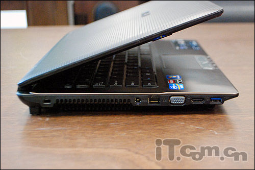 在华硕A43SA机身左侧的接口分别是:安全锁孔、散热格栅、电源适配器接口、RJ45网络接口、VGA接口、HDMI接口、1个USB3.0接口。