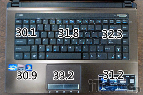小编在开机连续运行华硕A43SA四小时后,用红外探温仪考察机身表面和背面的重点部位的温度。我们测试的结果是——C面的平均温度基本平均在32度左右也没有出现很大的波动,而D面的最高温度出现在中间以及出风口的位置,却也只是在34度左右徘徊,因此说这款华硕A43SA在长时间的高负载进行时温度非常稳定,散热的情况也是非常的清爽。