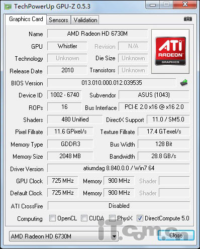 这款华硕A43SA标配的AMD Radeon HD 6730M独立显卡应该是属于AMD定位在中高端娱乐应用的显卡系列。从3D MarkVantage的成绩来看,总成绩达到了E19984分,其中GPU得到了21703分,处理器为16147分,因此说AMD Mobility Radeon HD6730M显卡凭借较高的主频,2GB的显存容量以及128bit的显存位宽,完全适用于主流3D娱乐环境。