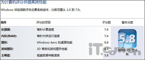 首先我们来看一下这款华硕A43SA的Windows的自测索引的分数吧,果然,在这里我们看到其中硬盘5.8分得成绩拖累了整体的平均分数。