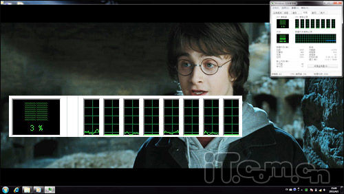 而在多媒体播放的过程中,我们看到1080p编码的高清影片中,华硕A43SA同时开启了四核芯八线程,再一次证明了这款i7-2630QM处理器的性能强悍的表现,CPU的占用率一直都是在5%以下浮动。