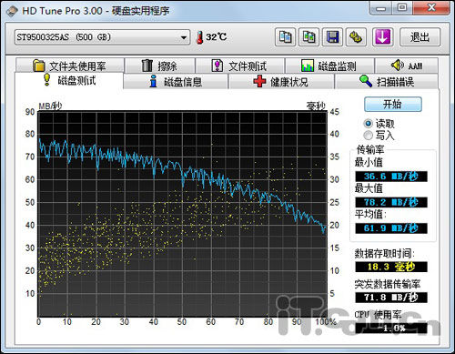 最后我们一起来看一下关于HD Tune硬盘的测试,在上面Windows的自测索引中我们发觉这款机器的短板可能出现在硬盘上面,因为对于一款拥有i7芯、搭载HD 6730M独显的笔记本,500GB 5400转的硬盘或许有些鸡肋了,其实用户可以自己升级一下硬盘,也是非常方便的。