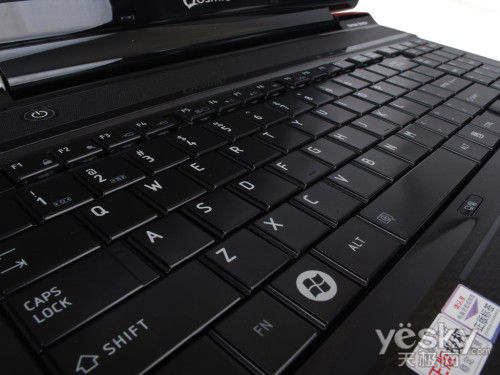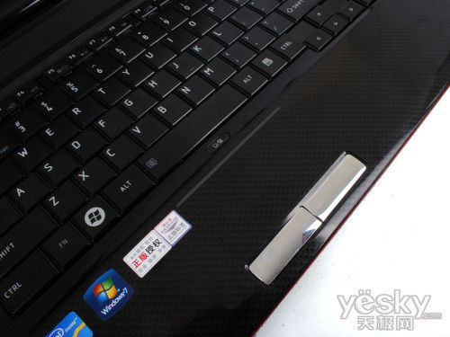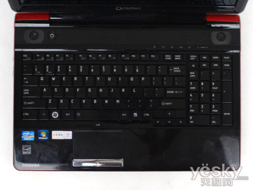 东芝Qosmio F750采用了全尺寸巧克力键盘,并配备了小数字键盘,手感不错。键盘面整体选择了黑色的主色调,与顶盖的红色搭配,非常霸气。