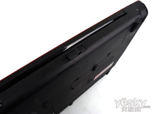 通过东芝Qosmio F750机身后端的按钮,我们可以打开笔记本的电池仓。