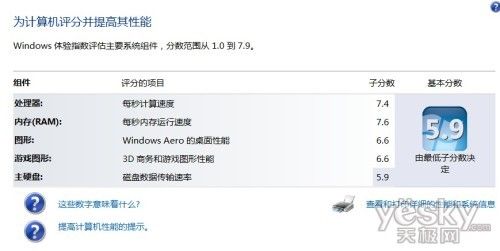 在Windows7体验指数中,东芝Qosmio F750无论是在处理器、内存还是显卡的游戏图形得分上都非常优秀,但容量750GB的硬盘由于是5400转/分,因此在读取速度上是东芝Qosmio F750整机最弱的一环,得分5.9。