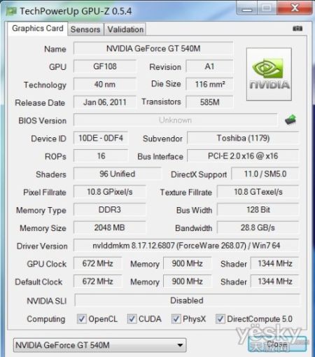 显示方面,东芝Qosmio F750采用了NVIDIA GeForce GT 540M独立显卡,拥有2GB独立显存,128bit位宽,核心频率672MHz,显存频率900MHz,并支持OpenCL、CUDA、PhysX、DirectCompute等多种技术,是一款DirectX 11的显卡。