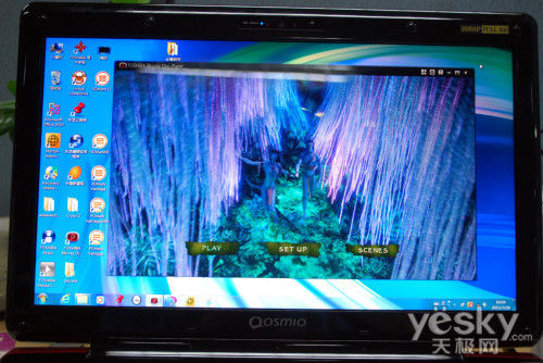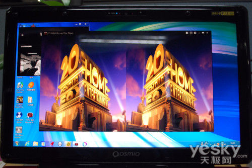 当我们使用裸眼3D专用的东芝蓝光播放器在3D下进行播放时,两个画面就分别被投映到了用户的左眼和右眼,形成了3D影像。目前东芝Qosmio F750暂时只能通过自带的东芝蓝光播放器才可以播放3D片源,或者实时地将2D片源转化为3D进行播放,所支持的影片格式十分有限。