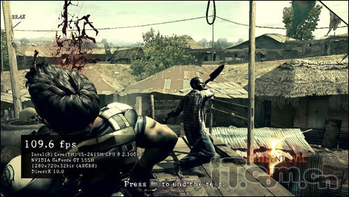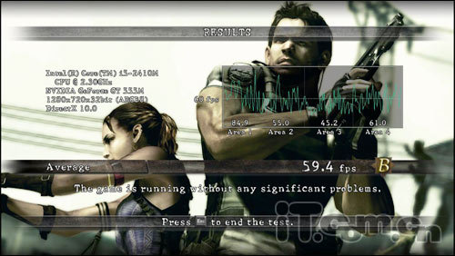 接下来是对《生化危机5》的PC版进行的测试,《生化危机5》支持NVIDIA的3D视觉效果技术(GeForce 3DVision),当然也包括物理加速技术。在DirectX10.0模式下,我们将游戏分辨率设置为1280x720,将所有游戏特效设置为高,得益于DX11的支持,在测试过程中,华硕N45SF整机表现的是非常的流畅的,帧数也在60帧上下浮动,虽然测试结果是B,但是经常完游戏的朋友肯定会了解,一款游戏如果能达到60帧,那么这款游戏无论是在画质、速度以及画面上绝对是超级给力的。
