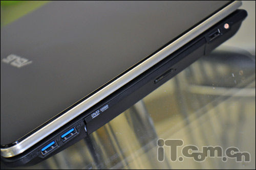 下面我们来看一下这款华硕N45SF的具体接口情况,在华硕N45SF的右侧机身的接口分别是2个USB3.0接口、DVD光驱、1个USB2.0接口、SonicMaster低音炮接口。