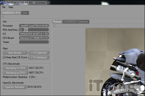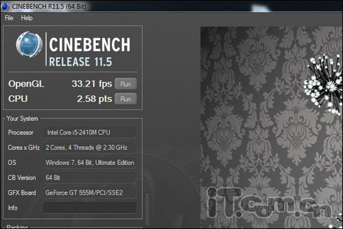 首先对于一颗i5的芯,处理器的表现已经是优秀的了,在CINEBENCH R10的测试中,单核心4621CB,多核心9607CB的成绩已经在我们意料之内的了。而在CINEBENCH R11.5的测试结果中,33.21fps以及2.58pts也就没有什么异议了。