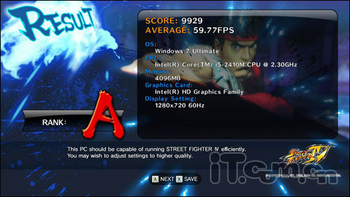 首先我们选取的是一段《街头霸王4》的pc版进行测试,我们把游戏的所有特效均设置为默认画质,分辨率为1280x720。测试结果是A。我们发现这款华硕N45SF在游戏过程完全可以达到骨灰级玩家的要求,因此说这款华硕N45SF完全可以流畅的运行当下大型3D主流游戏的。