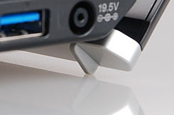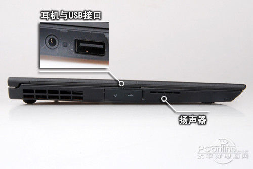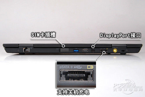 ThinkPad X1机身左侧有一个USB2.0接口,以及耳机接口,机身右侧则为SD卡槽和无线网络开关。其绝大部分接口都设计在机身后侧,包括一个USB3.0、一个eSATA/USB 2合1接口 (powered),一个mini DisplayPort几口、HDMI接口以及SIM卡槽和RJ-45接口。由于没有VGA接口,ThinkPad X1标配附件中自带了一个VGN转换线,这样商务用户就不用担心投影仪的连接问题了。