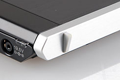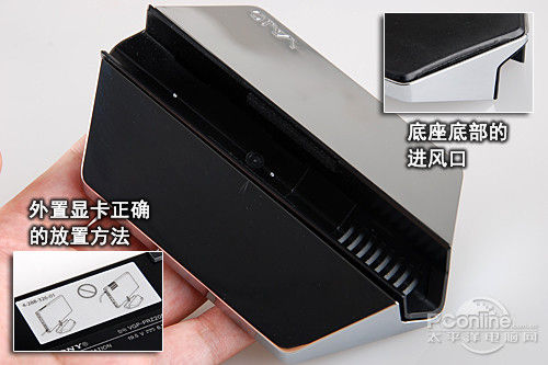 对于其内置的HD6550M独立显卡我们会在性能篇中进行详细介绍,这里先说其接口的布置。索尼Z2的多功能拓展基座在材质上同样采用了碳纤维复合材料,其六棱形设计和颜色都与Z2主机相呼应。利用随多功能扩展基座附带的支架,该基座可以立于主机一侧,而且支架底座设计有与拓展基座相对应的散热口,用户在摆放时可以实际情况横放或竖放,不必担心散热问题。
