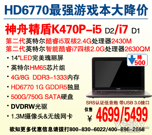 进入12月,由于硬盘短缺而引发的笔记本电脑涨价风波远未停息,今年年底的笔记本市场异于往年销售火爆的场景,如果您还在持币观望,那么今天推荐的这两款逆势狂降的强劲游戏本,绝对是您入手笔记本的不二选择!神舟精盾K470(参数 图片 文章 论坛)P系列笔记本自诞生以来,就立足于14吋最强游戏本的高端定位,它采用14吋无亮点瑰丽屏,搭载SNB双核处理器i5-2430M/i7-2630QM,配AMD最新的HD6770 1G GDDR5高端独立显卡,其3DMark Vantage高达26000分以上,玩主流3D游戏爽到爆,同时,SRS认证的低音炮音箱、USB3.0接口等前沿周边设备的加盟,使得精盾K470P-i5/i7成为一个完美的影音数码娱乐平台。本周精盾K470P-i5/i7逆势降价促销,您仅需4699/5499元的实惠价格就可拥有这一游戏神器,千万别错过啦!