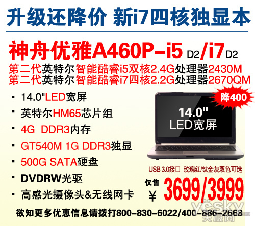 随着笔记本电脑不断更新换代,笔记本的价格也不断地刷新着,几年前我们要买一款性能不错的本本动则要花费八九千年甚至上万元,现在只要您眼光独到,仅花费3000元左右就可拥有一款能性能良好价格实惠的笔记本电脑,满足您日常工作娱乐多重需求。今天为您推荐这款神舟优雅A460P-i7,它最新升级为第二代酷睿i7四核处理器2670QM,还装备了GT540M 性能级独立显卡,4G DDR3内存,500G 硬盘,USB 3.0的接口,整机运行高效快捷;外观上,优雅A460P拥有魅惑时尚的玫瑰红和刚毅睿智的钛金灰双色外观。为迎接“双蛋”到来,优雅A460P-i7升级还降价,逆市降至3999元,同时其兄弟产品神舟优雅A460P-i5也降价促销,仅售3699元!感兴趣的朋友赶快到全国各大神舟专卖店选购吧!