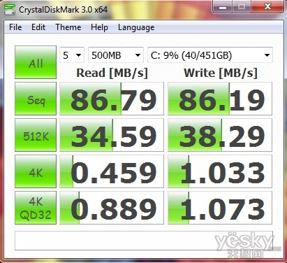 酷睿i3- 2310M双核处理器速度已经足够快,即使应对高强度的办公应用需求也不在话下,虽然4GB的内存已足够,但是曾大到6GB肯定不会有害处。据CrystalDiskMark硬盘驱动器性能测试,笔记本硬盘能够达到约86 MB / s的读取速度,不是特别快,但也不是很差劲。