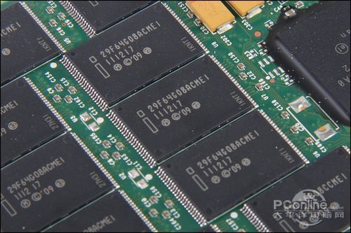 Intel 320系列固态硬盘采用采用25nm的MLC NAND,编号为29F64G08ACMEI,单颗容量为8G。25nm的闪存颗粒除了单颗容量比34nm的大以外,写入能力也更强,最新的25nm的颗粒也加入了AES-128位加密技术。同时工艺提升价格下降,成本上也更有优势。