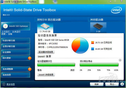 Intel SSD Toolbox 3.0工具箱支持包括简体中文在内多国语言包,支持Windows xp/vista/7系统,提供SSD优化、快速/全面诊断、安全猜出和固件更新等功能。点击Intel SSD Optimizer按钮,然后在弹出确认窗口后再点一次Run就开始优化了,另外在优化SSD的过程中,并不会影响SSD使用,所以在任何时间都可以对SSD进行优化。