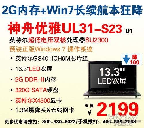 笔记本的诞生无疑是取缔了PC的笨拙之处,轻薄便携成了笔记本专属的代名词,小巧的机身完全不用怀疑其应用性,在日常操作和基本商务操作中,笔记本电脑完全可以胜任。13.3吋长续航便携轻薄本神舟优雅UL31-S23降价秒杀2199元!神舟优雅UL31-S2采用英特尔超低电压双核处理器SU2300,搭载X4500显卡、2G内存、320G硬盘和锂离子聚合物电池超长的续航时间在性能上笑傲群雄,它除了内置130W摄像头、无线网卡等主流配备外,还预装Windows 7操作系统,带来更优化的使用环境,进一步提升了轻薄型超低电压笔记本在全球范围内市场占有率!