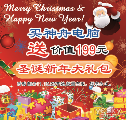 现在购买神舟电脑,还可免费获赠价值199元的圣诞新年大礼包,数量有限,先到先得,为您欢庆圣诞再添超值惊喜!