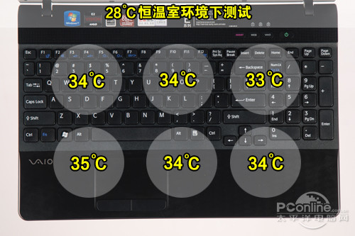 当今笔记本用户在考虑性能的同时,散热、续航也渐渐成为了关注的焦点,这也成为判别一款笔记本电脑是否优秀的关键。索尼111t的散热可以说是相当不 错,与VPCEK-111t一样VPCEL-111t同样是在连续运行生化危机5两个小时之后进行温度测试,索尼111t的键盘区温度最高为35度,算是 属于舒适的使用范围(见下方温度舒适度对比),再看看机身背部温度,同样最高温度也只有35度,最低温度为33度,两款笔记本的散热都非常不错。