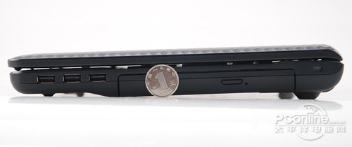 我们用一元硬币来对比索尼111t的厚度,这样可以更加直观的展示给大家。从上图来看索尼111t的厚度要比竖置的一元硬币还要厚上一点,再看看它的重 量,索尼111t的整机重量为2.445kg,旅行重量为2.711kg,15.5寸的屏幕虽然可视面积更大,但是同样重量也要付出一定代价。