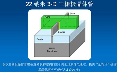 22纳米3-D三栅极晶体管在低电压下将性能提高了37%,而且只需消耗不到一半的电量,就能达到与32纳米芯片中2-D平面晶体管一样的性能。