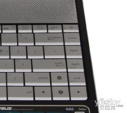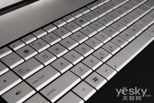 键盘方面,采用了银色的工程塑料材质,与机身上方的长条形扬声器很好的融合在一起。更为特别的是,这款笔记本的键盘采用了传统键盘的全尺寸键 帽,键帽可接触的面积变大了,使得键盘敲击起来更为舒适,但是相对于目前运用较多的巧克力键盘来说,这种传统键盘由于键程缝隙较大,因此细小异物也更容易 掉落到键帽下面,清理起来比较麻烦。