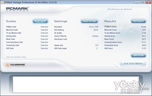 PCMark Vantage可以衡量各种类型PC的综合性能。测试内容可以分为处理器测试、图形测试、硬盘测试,通过各项测试从而最大的了解机器的性能。PCMark Vantage测试结果显示,在分辨率为1024 x 768情况下总体得分6108,从各项得分来看整体性能依然不错,足以满足日常办公娱乐需要。