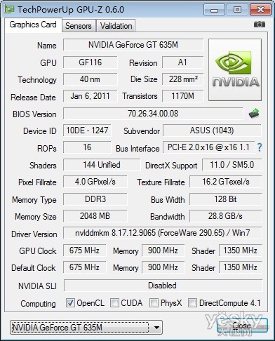 显卡方面,搭载了2GB DDR3显存NVIDIA GeForce GT 635M独立显卡,基于40nm制程工艺设计,拥有144个流处理器、2GB DDR3显存、128bit显存位宽,核心频率为675MHz,属中端显卡,应对主流的大型3D游戏是没有问题的。