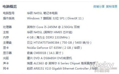 | 显卡芯片 | NVIDIA GeForce GT 635M |