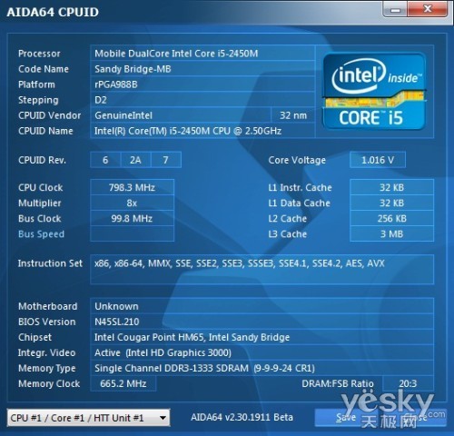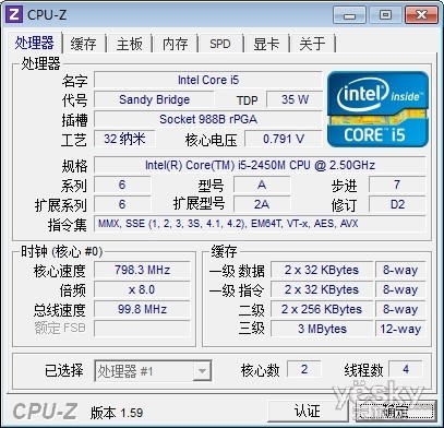 通过AIDA 64的CPUID工具测试酷睿i5 2450M处理器的基本信息,我们可以看到该处理器是基于32nm制程工艺,核心代号为Sandy Bridge,初始主频为2.5GHz,睿频可加速至2.90GHz,共享的三级缓存为6MB,整体TDP为65W,处理器性能非常不错。