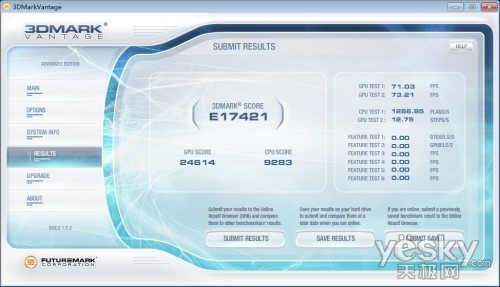 3DMark Vantage是业界第一套专门基于微软DX10 API打造的综合性基准测试工具,并能全面发挥多路显卡、多核心处理器的优势,能在当前和未来一段时间内满足PC系统游戏性能测试需求。通过3DMark Vantage测试,1024 x 768分辨率下,得分17421,其中GPU得分24614,评测得分不俗,综合说来性能非常不错,完全能够满足日常的影音娱乐需要,在中低画质下运行主 流的大型3D游戏也是没问题的。