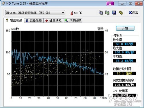 作为为一款主打影音娱乐功能的笔记本,其存储空间也是大家十分关心的问题。如今高清电影以及大型3D游戏一个就能占十几G的存储空间,因此,硬 盘大小也是大家选购电脑的一项指标。华硕N45SL配备了750GB的7200转硬盘,无论空间还是速度都是非常不错的。通过HD Tune 软件测试,结果显示最大值为106.8MB/秒,平均速度为78.3MB/秒,硬盘在性能以及速度方面表现一般。 内存方面配备了单条4G DDR3内存,最大支持内存8GB。