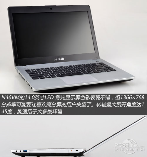 华硕N46VM采用14英寸16:9 LED背光屏幕,屏幕为雾面的设计,在光线较强的环境下也能够让用户看清现实内容。