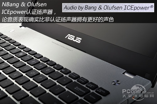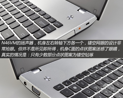 键盘上方左右两侧以实体按键为中心,通过机床又大到小的打孔带来由深到浅的颜色变化,看上去就像声音的由近及远,也体现了华硕N46VM主打音乐的市场定位。