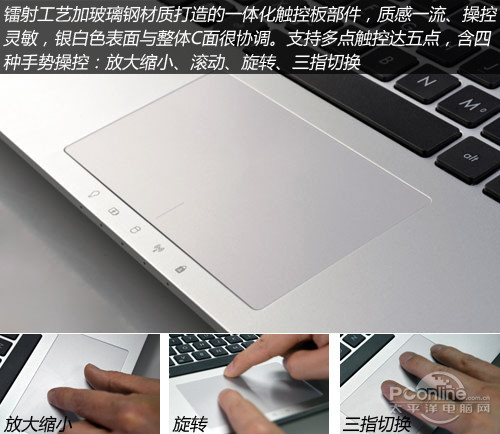 一体化设计的触控板采用玻璃钢材质制成,用手指摸上去会觉得有细微毛玻璃的感觉。触控板面积较大,更加适合多点触控的操作。