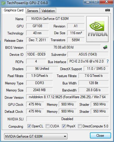华硕N46VM配备NVIDIA GeForce GT 630M独立显卡,显存达到2GB,它并不是最新的开普勒架构,但跑分成绩相当不错。