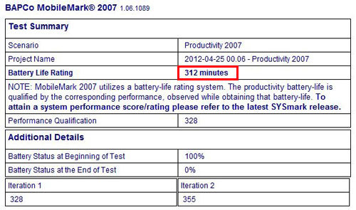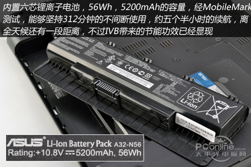 华硕N46VM标配56Wh六芯锂离子电池,通过MobileMark 2007的测试,在屏幕最高亮度的状态下,续航时间大约为5小时,对于一款消费类笔记本来说,表现尚可。