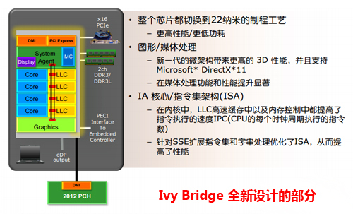 22nm工艺加第三代HKMG技术,DX11、OpenCL 1.1图形核心和新一代视频转码引擎、增强的AVX指令集、双通道DDR3-1600内存控制器、原生支持USB 3.0、PCI-E 3.0控制器。热功耗设计方面,部分四核产品为35W(i7-3612QM即是),填补了SNB的空缺。