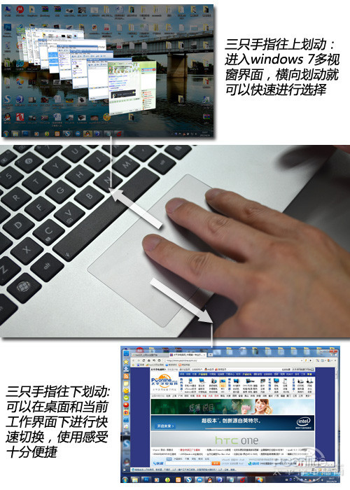 华硕N46的触控板支持5点触控,不过它目前只提供了从一根手指头到三根手指头的手势动作,两根手指头可以进行放大、翻转、网页下翻等功能,而三根手指头则是可以进行页面切换。这一点让人非常惊喜,只是手势动作数量还不如苹果的IOS系统那样丰富,不过操作感觉并没有太大区别。如果官方的软件工程师能够设计出更多的动作,那么win7平台的用户也可以体验手势的便捷性了。