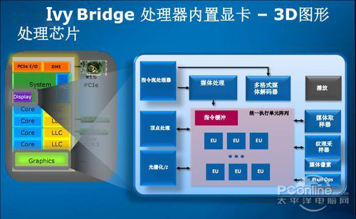 Ivy Bridge核芯显卡采用了22nm制程工艺,这样使得在小小的芯片内能塞入更多晶体管提升核显性能;新一代HD Graphics 4000/2500核显增加了EU可编程单元,带来了更强的3D性能和游戏性能;最后,从Ivy Bridge开始,核芯显卡开始支持原生三个独立显示。