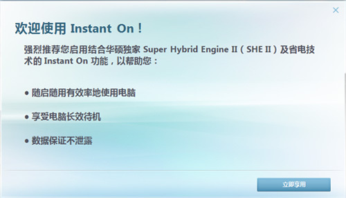 最后想说的是华硕独家Instant On技术,笔者的建议是如果重做了系统最好还是装上这个软件。因为它可使笔记本待机得到有效的延长,在休眠状态下,Instant On还会自动储存作业状态时的所有资料至内存中,所以可以实现2秒恢复到上次工作状态。当电量不足5%时,Instant On还会自动储存作业状态时的所有资料至硬盘,并于下次开机时自行复原。