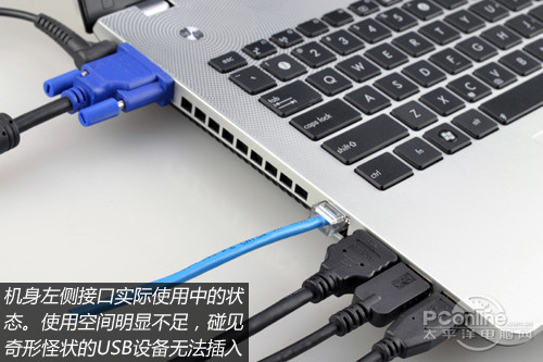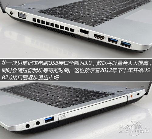 华硕N46VM的前端和后端都比较简洁,只有在前端左侧下方设计有一个多合一读卡器,来到接口最丰富的机身左右两侧,在机身左侧分别设有电源插孔、VGA、RJ45、HDMI以及2个USB3.0接口,而在机身的右侧分别为2.5mm低音炮插孔、1个USB3.0、DVD刻录光驱以及音频插孔。细心的朋友一定发现了,华硕N46VM并没有设置传统的USB2.0接口,取而代之的是3个USB3.0接口,如果从传输文件的角度上来讲,这绝对是一个利好,它可以以USB2.0 10倍的速度进行传输,节省了大量的时间。