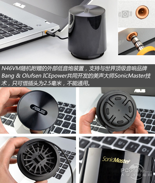 华硕N46VM随机附赠SonicMaster外部低音炮。从原理上讲,低音炮和扬声器的工作方式是完全一样的,只是震膜的直径更大,并且增加了用于共振的音箱。它可以使得音乐更加震撼,使你有一种身临其境的感觉。