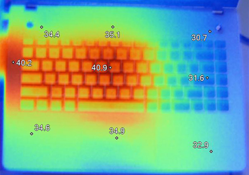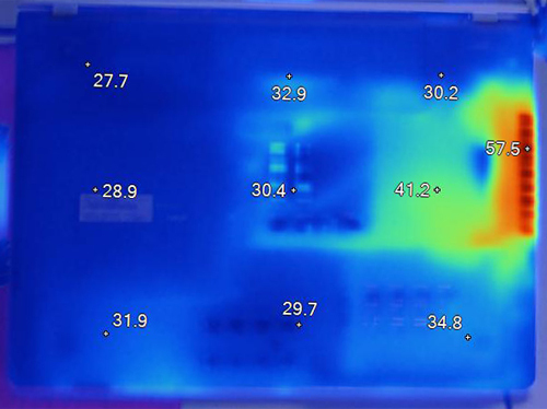 在28摄氏度的环境下,运行FurMark二十分钟,华硕N46VM的C面、D面的温控表现参照以上两图。其机身的大部分区域还保持在人体体温以下,只是由于C面为金属材质,导热性较好,所以在使用时左手会感到明显的热度,其它区域则相对舒适。由于底部进风口较多,所以并不建议膝上使用。