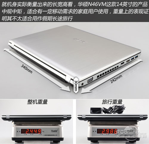 从重量上来看,华硕N46VM的整机重量为2.449kg,旅行重量为2.986kg,与一般的14英寸笔记本相比,这个重量并不占优势,而且还会稍重一些,不过这也是因为其机身大部分为金属材质的缘故。
